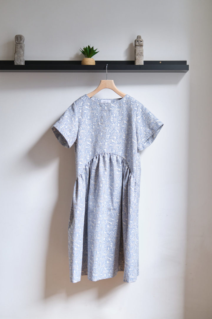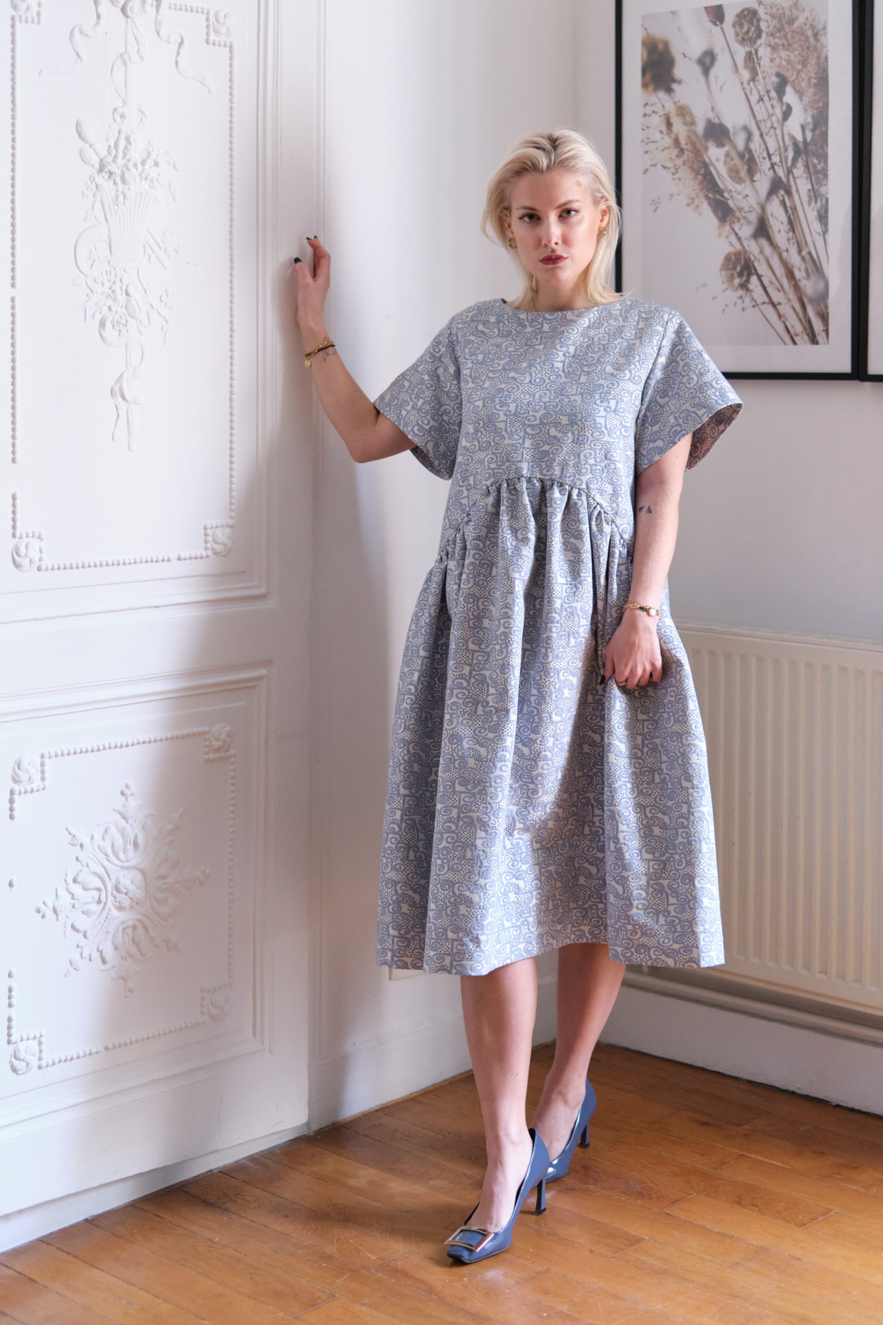 En coton texturé, légèrement brillant, avec effet marbré.Finitions coutures (coutures anglaises, biais) et ourlet fait main