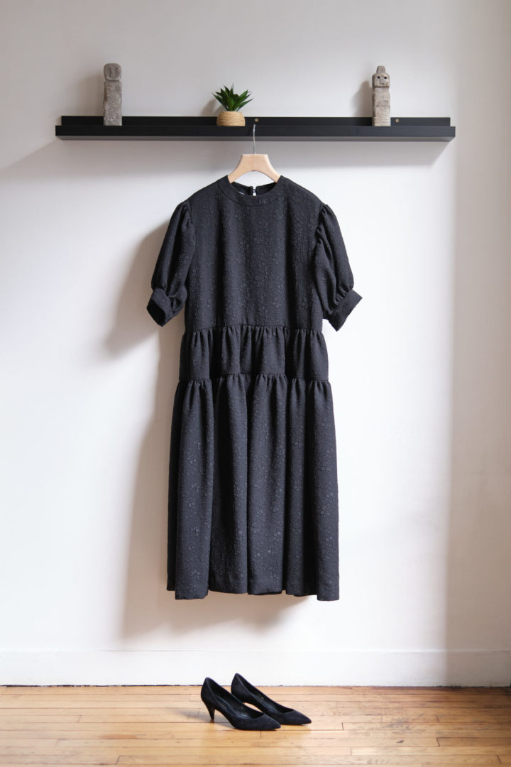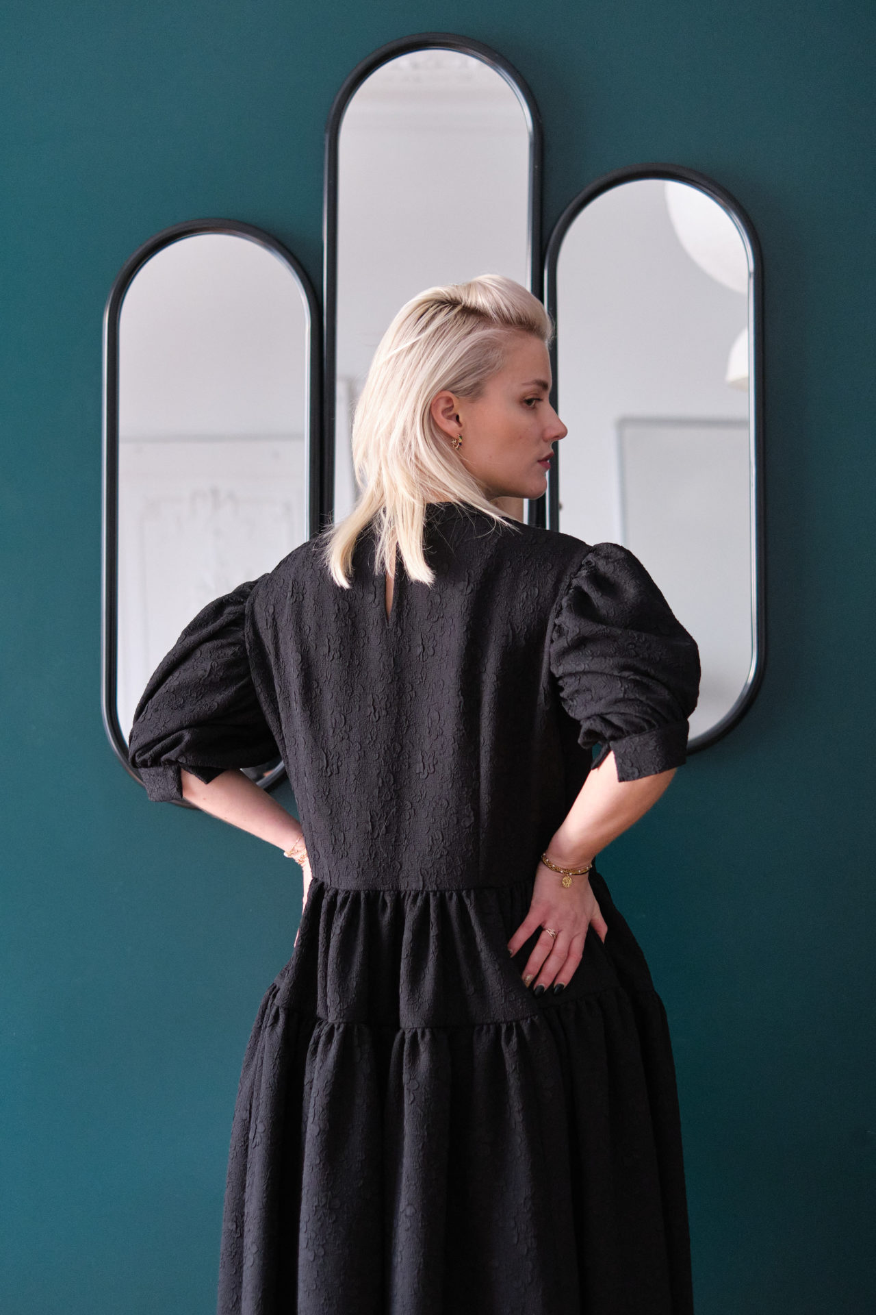 Coupe volumineuse et structurée pour cette robe midi. Elle présente des manches bouffantes et des empiècements qui lui confèrent une allure élégante et sophistiquée. Confectionnée en un magnifique jacquard noir (avec motif floral), elle se porte pour des occasions plus formelles le jour comme le soir, avec des escarpins à mi talon ou des chaussures plates.